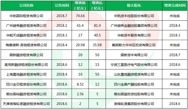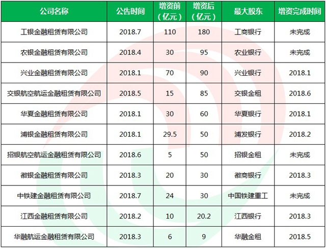截止到2018年7月12日,已有11家金融租賃公司獲得增資批復,總體增資金額超過200億元。