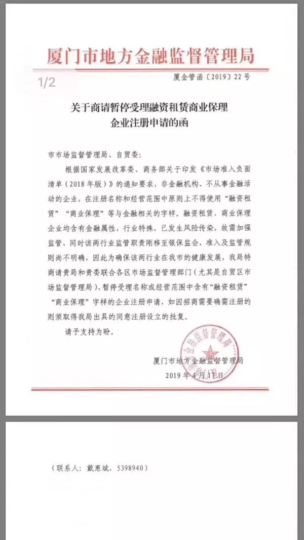 融資租賃、商業保理企業均含有金融屬性,行業特殊,已發生風險傳染,故霄加強監管,同時該兩行業監管職責剛移至銀保監會,準入及監管規則尚不明確,因此為確保該兩行業在廈門市的健康發展,廈門市地方金融監督管理局特商請廈門市市場監督管理局、自貿委聯合各區市場監督管理部門(尤其是自貿區市場監督管理局),暫停受理名稱或經營范圍中含有“融資租賃”“商業保理”字樣的企業注冊申請,如因招商需要確需注冊的則須取得廈門市地方金融監督管理局出具的同意注冊設立的批復。