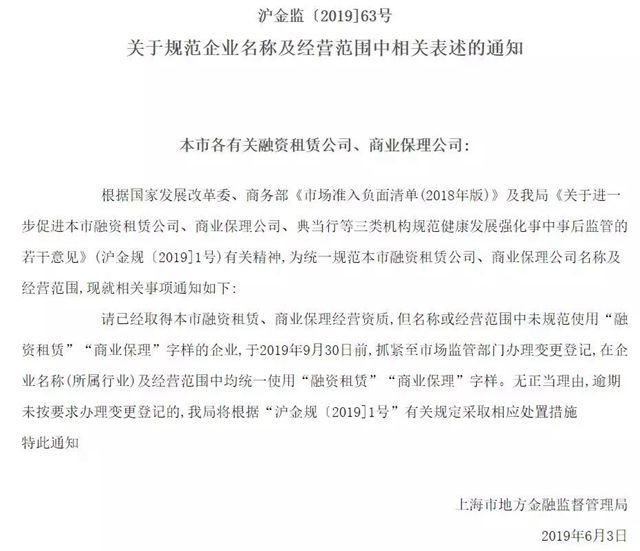 近日,上海市地方金融監督管理局公布一則通知,通知要求已經取得本市融資租賃經營資質,但名稱或經營范圍中未規范使用“融資租賃”字樣的企業,于2019年9月30日前,抓緊辦理變更登記,在企業名稱(所屬行業)及經營范圍中均統一使用“融資租賃”字樣。