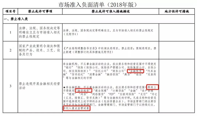 2018年底 ,國家發展改革委、商務部發布《市場準入負面清單(2018年版)》,負面清單由此前的地區試點,全面擴容至全國。新版的負面清單中,金融租賃和融資租賃依然各自單獨列出。