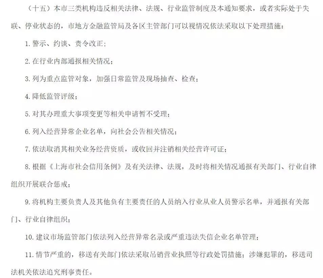 根據上述《意見》,違反相關法律、法規、行業監管制度及滬金規〔2019〕1號文件,或者實際處于失聯、停業狀態的,市地方金融監管局及各區主管部門可以視情況依法采取處理措施,包括責令改正、降低監管評級、列入異常企業名單、取消資質或注銷許可證等。
