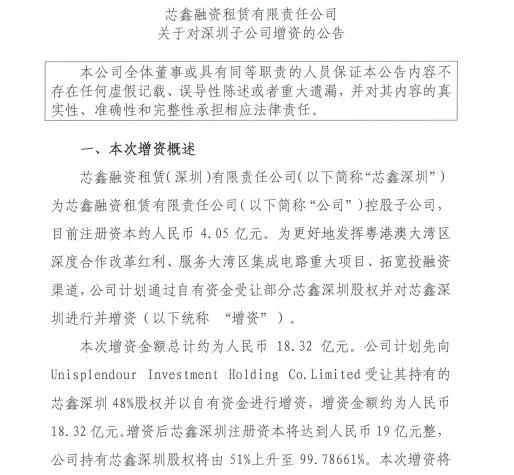 樸覓鑫獲悉,近日,芯鑫租賃為深圳控股子公司:芯鑫融資租賃(深圳)有限責任公司(下稱芯鑫深圳)增資,此次增資后,芯鑫深圳注冊資本金將由4.05億增至19億。